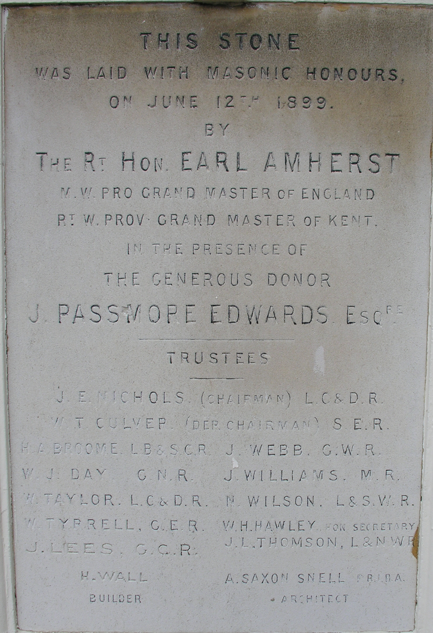 The foundation stone pictured on the Home Page is at Elliott House nursing home in Beltinge, Herne Bay. The history of this building together with many others nearby and in other parts of the country is very interesting and really part of a much larger picture of the philanthropic life of J Passmore Edwards (a Freemason) who appears on the foundation stone as:
